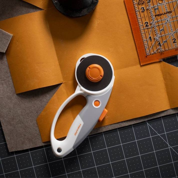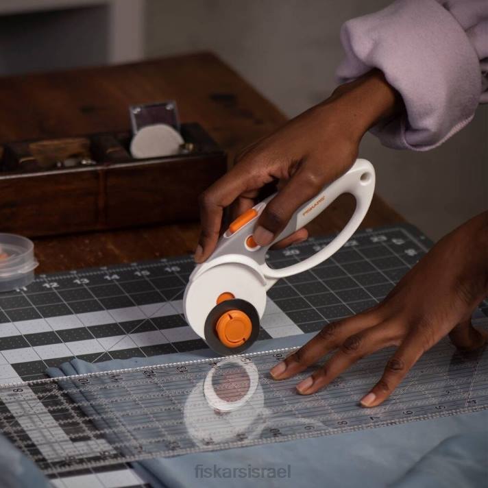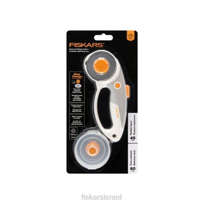 - חותך סיבובי מסוג fiskars easy change duoloop הוא כלי 2 ב-1 חוסך מקום that יכול להחליף בקלות בין להבים בגודל 45 מ”מ ל-60 מ”מ