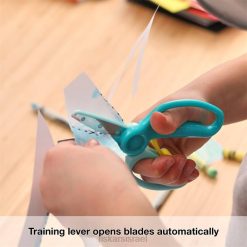 - כאשר מופעלת, ידית האימון פותחת אוטומטית את הלהבים לאחר כל חיתוך, ומאפשרת לילדים להתמקד בסגירתם כשהם לומדים לחתוך נייר